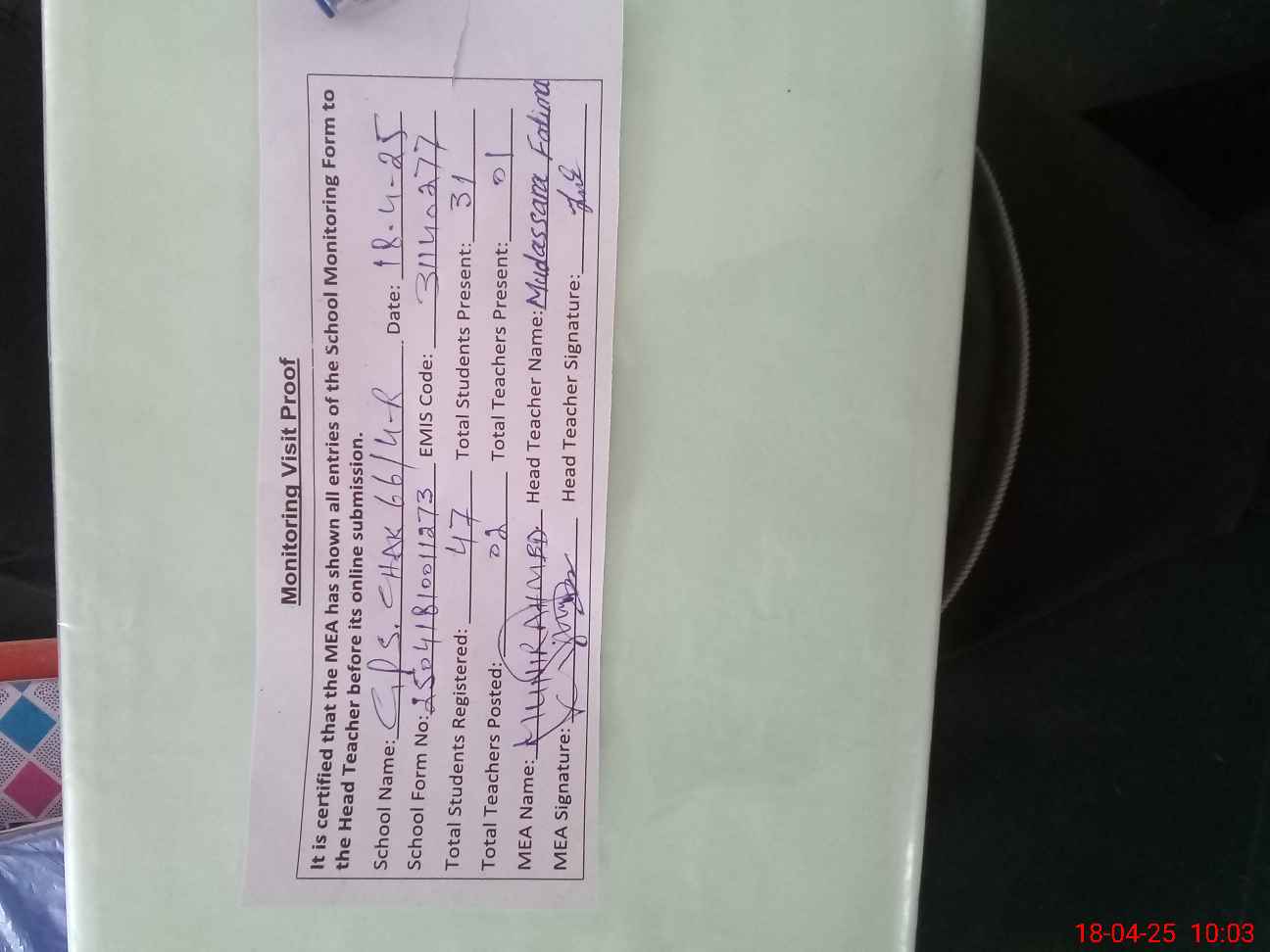 | Attendance Register | Head Teacher | MEA with School | Visit Proof |
