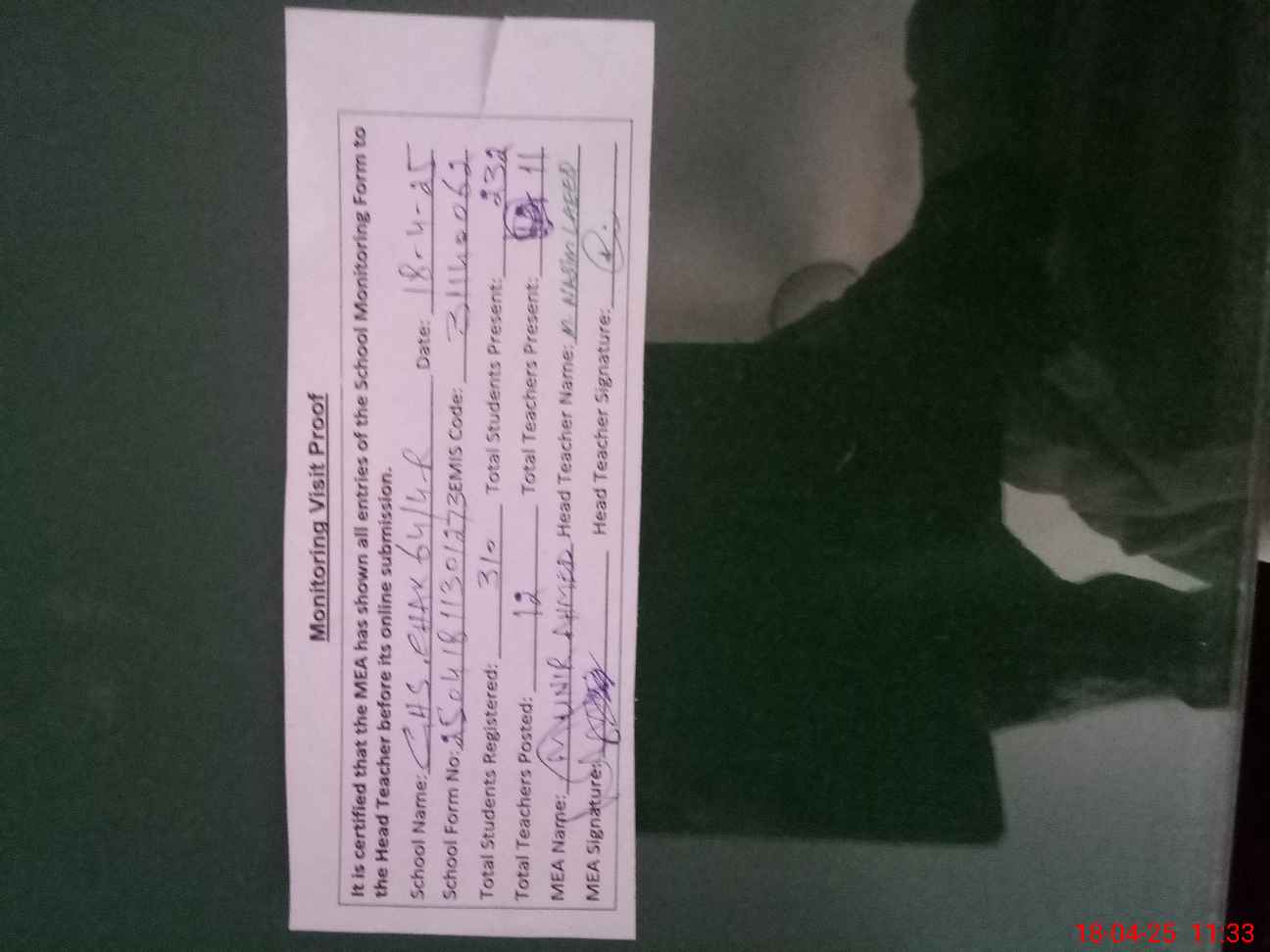 | Attendance Register | Head Teacher | MEA with School | Visit Proof |