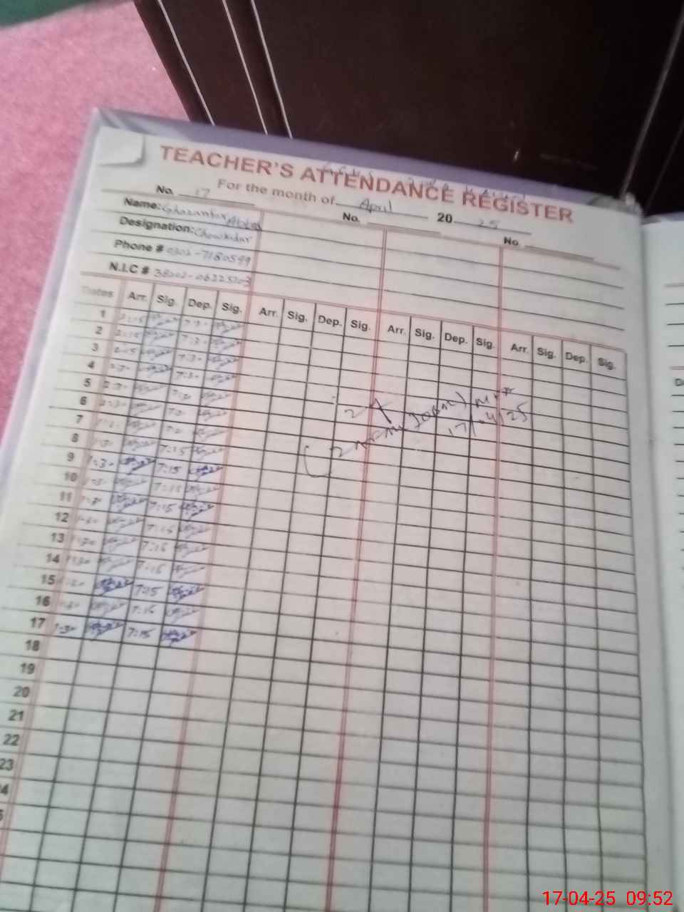 | CNIC | Full Name | Designation | R/C | Absence during last cal. month |