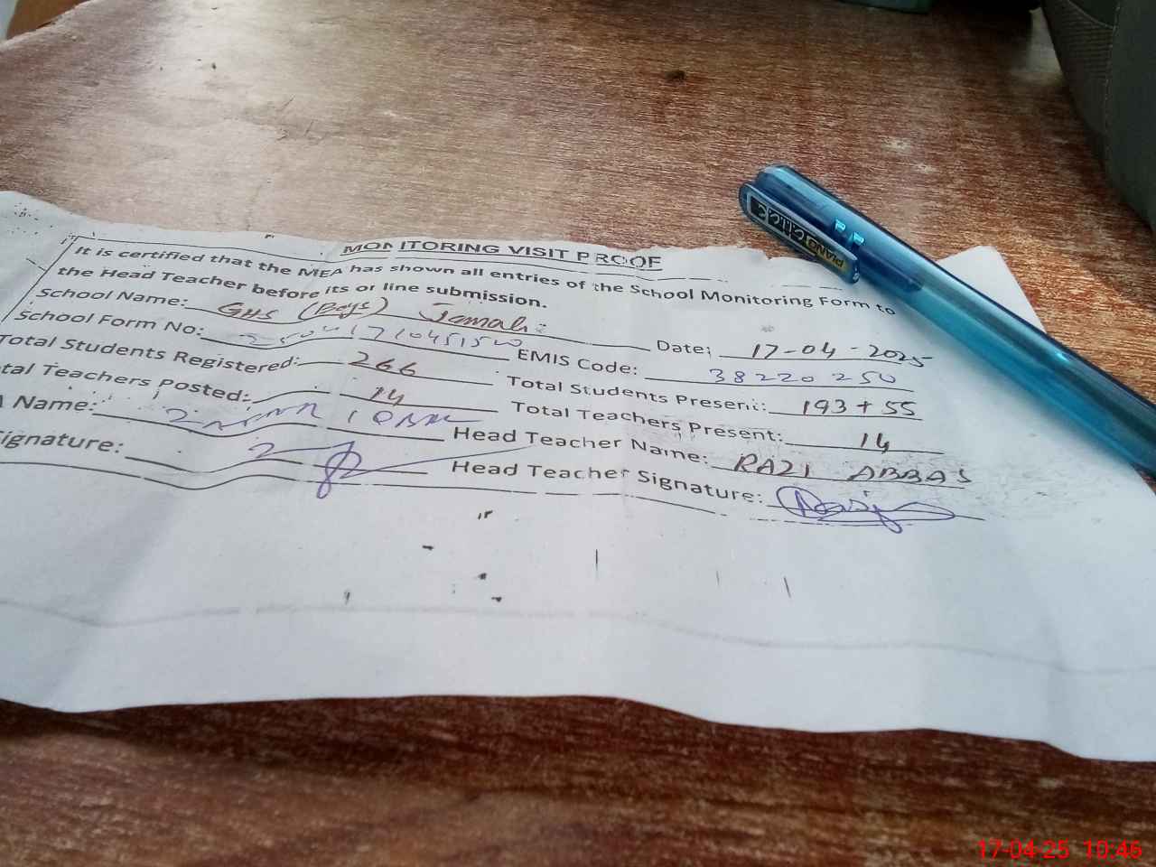 | EMIS Code: 38220250 | Name of School: GHS JAMALI | |||