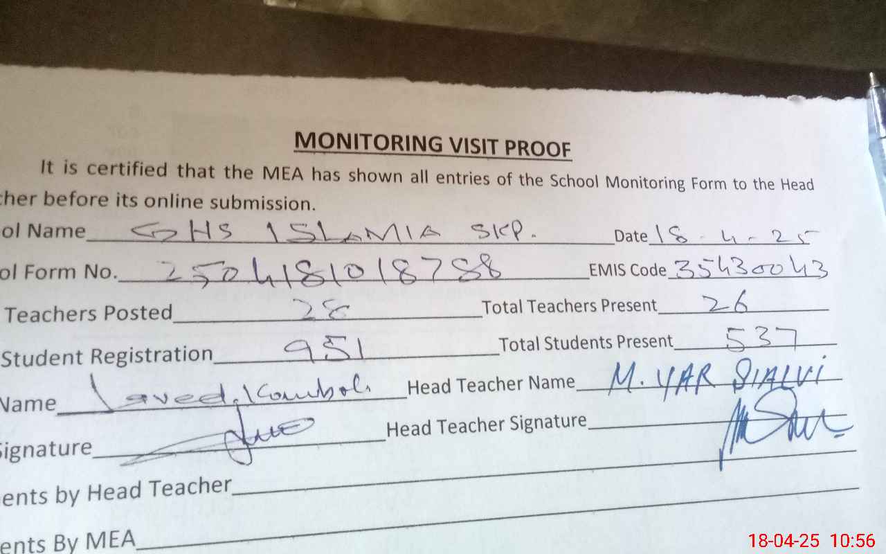 | Attendance Register | Head Teacher | MEA with School | Visit Proof |
