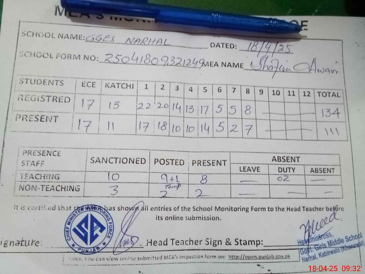 | Attendance Register | Head Teacher | MEA with School | Visit Proof |