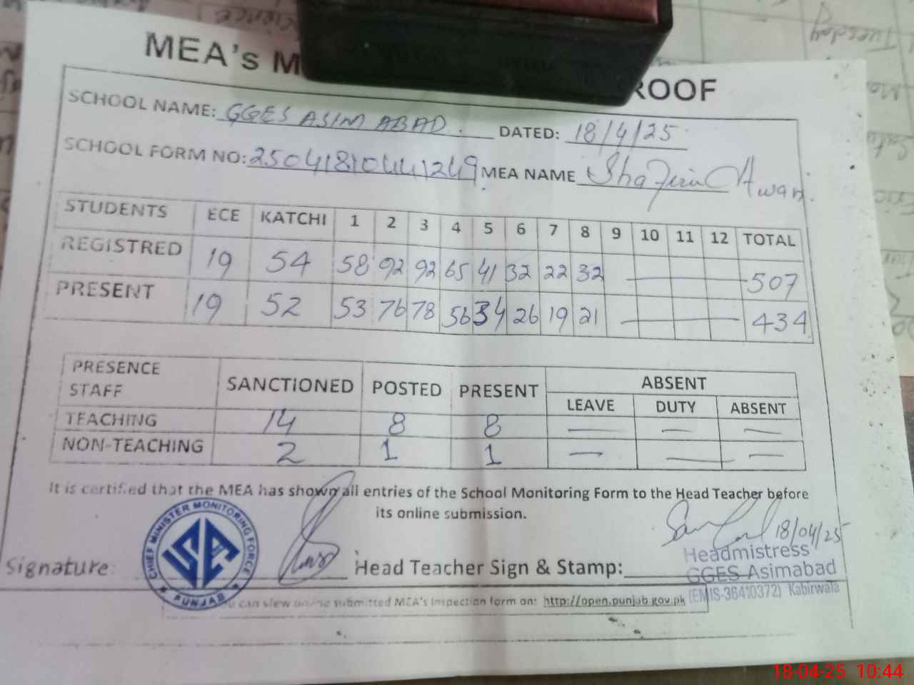 | EMIS Code: 36410372 | Name of School: GGES ASIM ABAD, KABIRWALA | |||