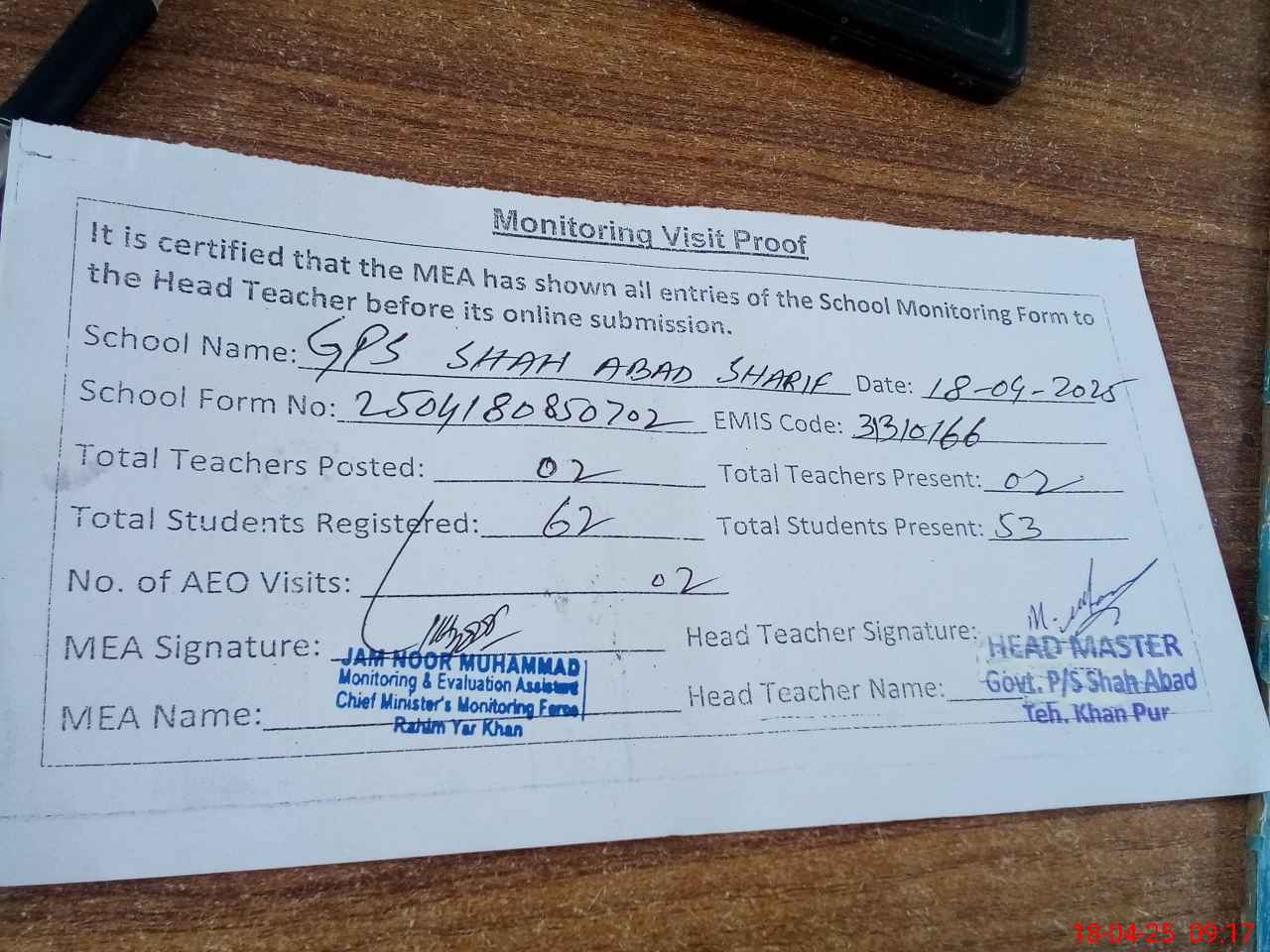 | Attendance Register | Head Teacher | MEA with School | Visit Proof |