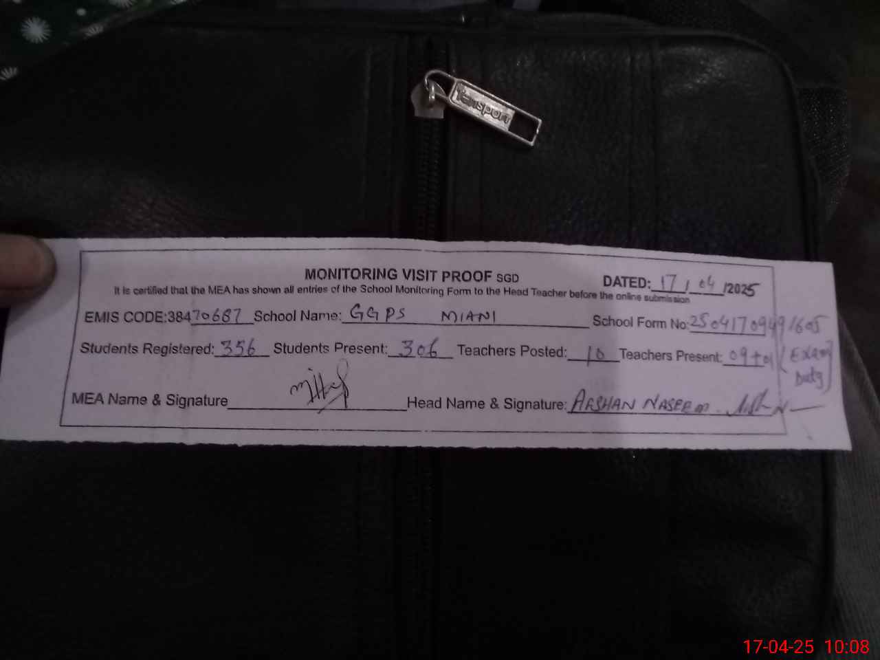 | Attendance Register | Head Teacher | MEA with School | Visit Proof |