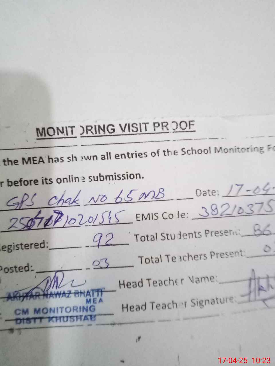 | Attendance Register | Head Teacher | MEA with School | Visit Proof |