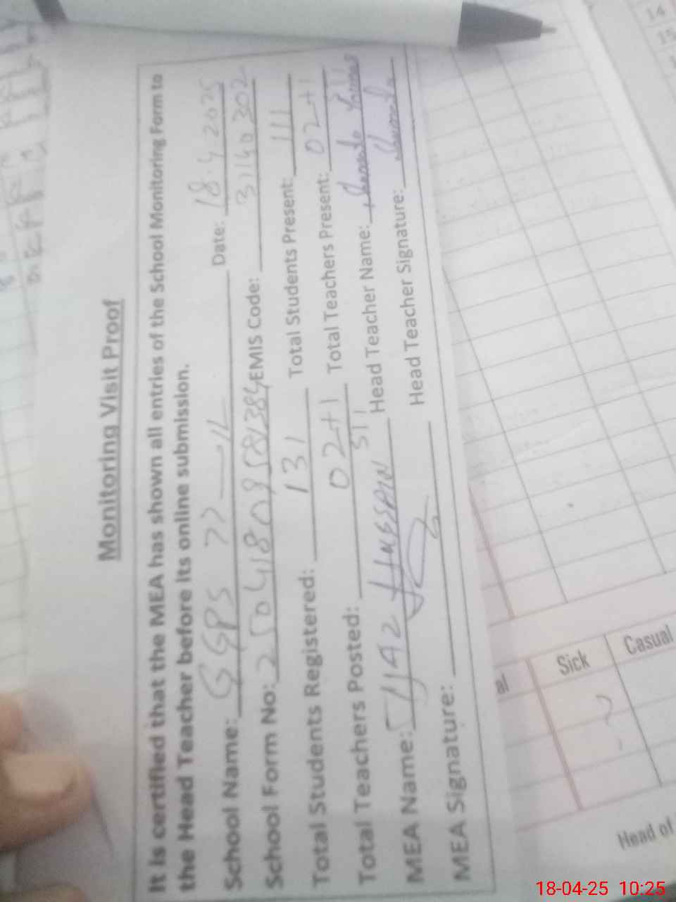 | Attendance Register | Head Teacher | MEA with School | Visit Proof |