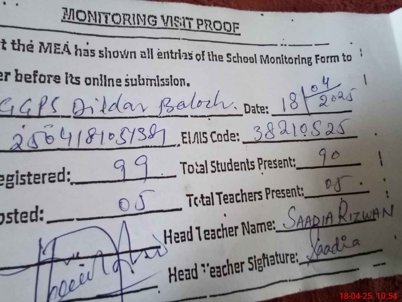 | Attendance Register | Head Teacher | MEA with School | Visit Proof |