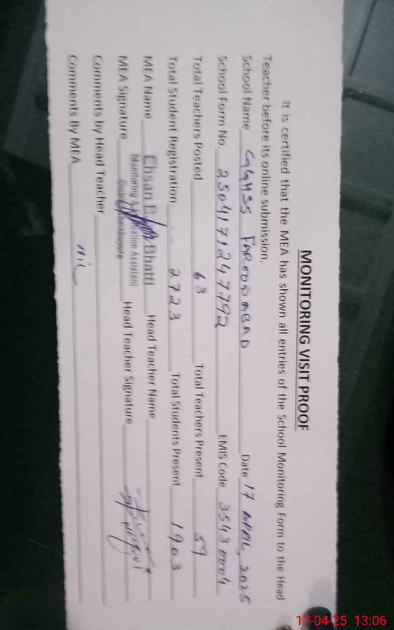 | Attendance Register | Head Teacher | MEA with School | Visit Proof |