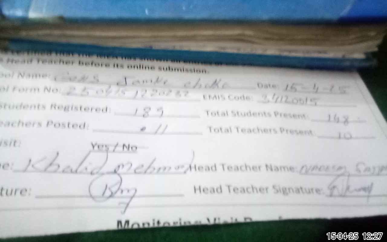 | EMIS Code: 34120015 | Name of School: GHS JAMKAY CHATHA | |||