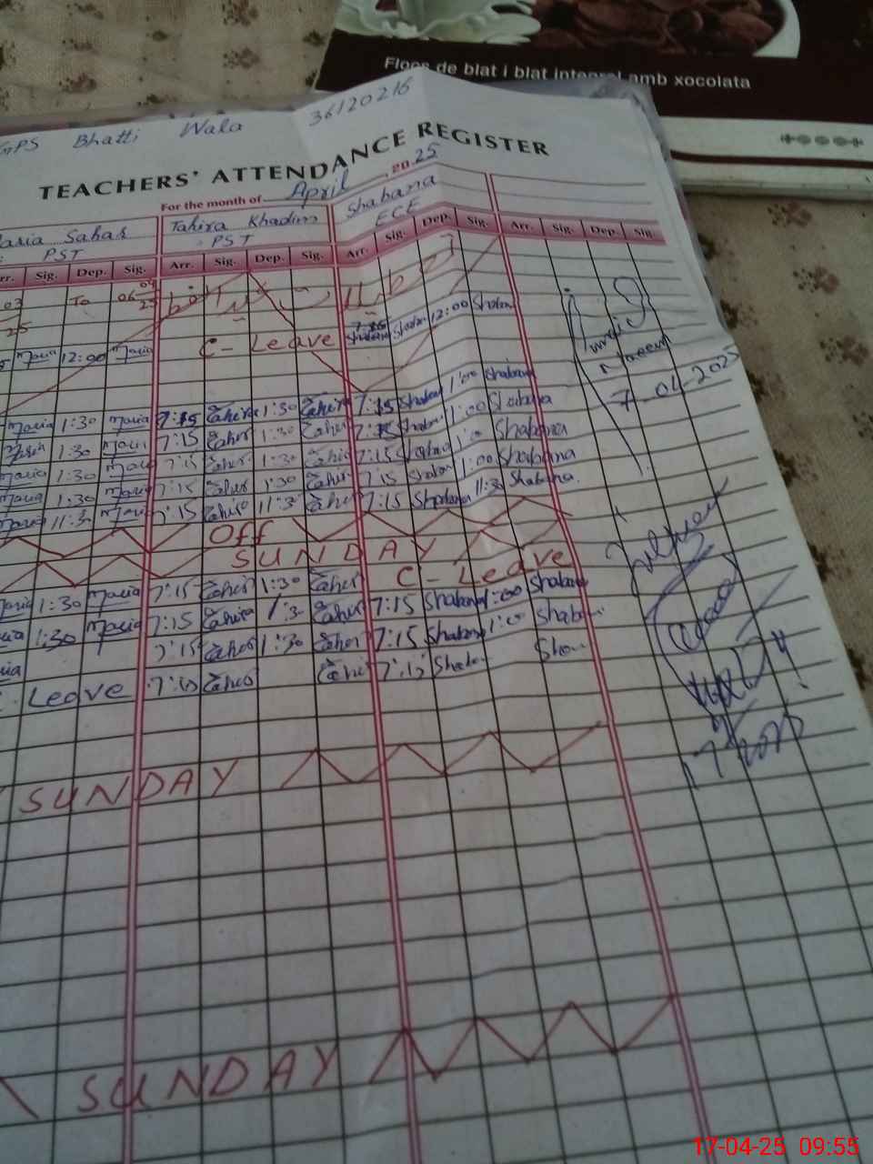 | CNIC | Full Name | Designation | R/C | Absence during last cal. month |