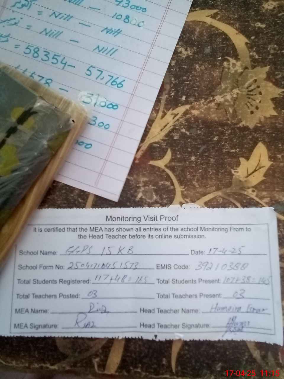 | Attendance Register | Head Teacher | MEA with School | Visit Proof |