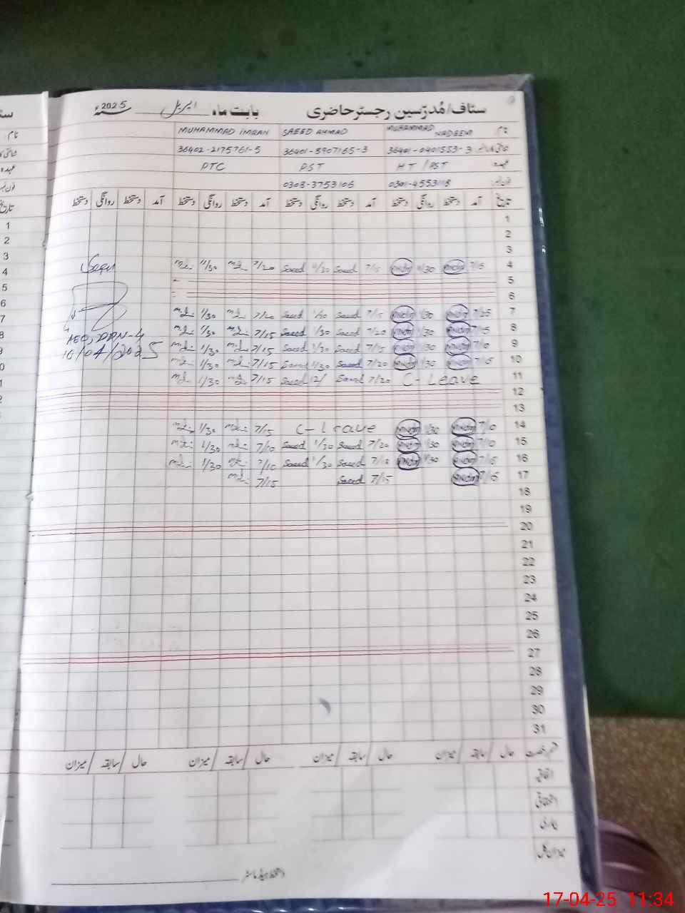 | CNIC | Full Name | Designation | R/C | Absence during last cal. month |