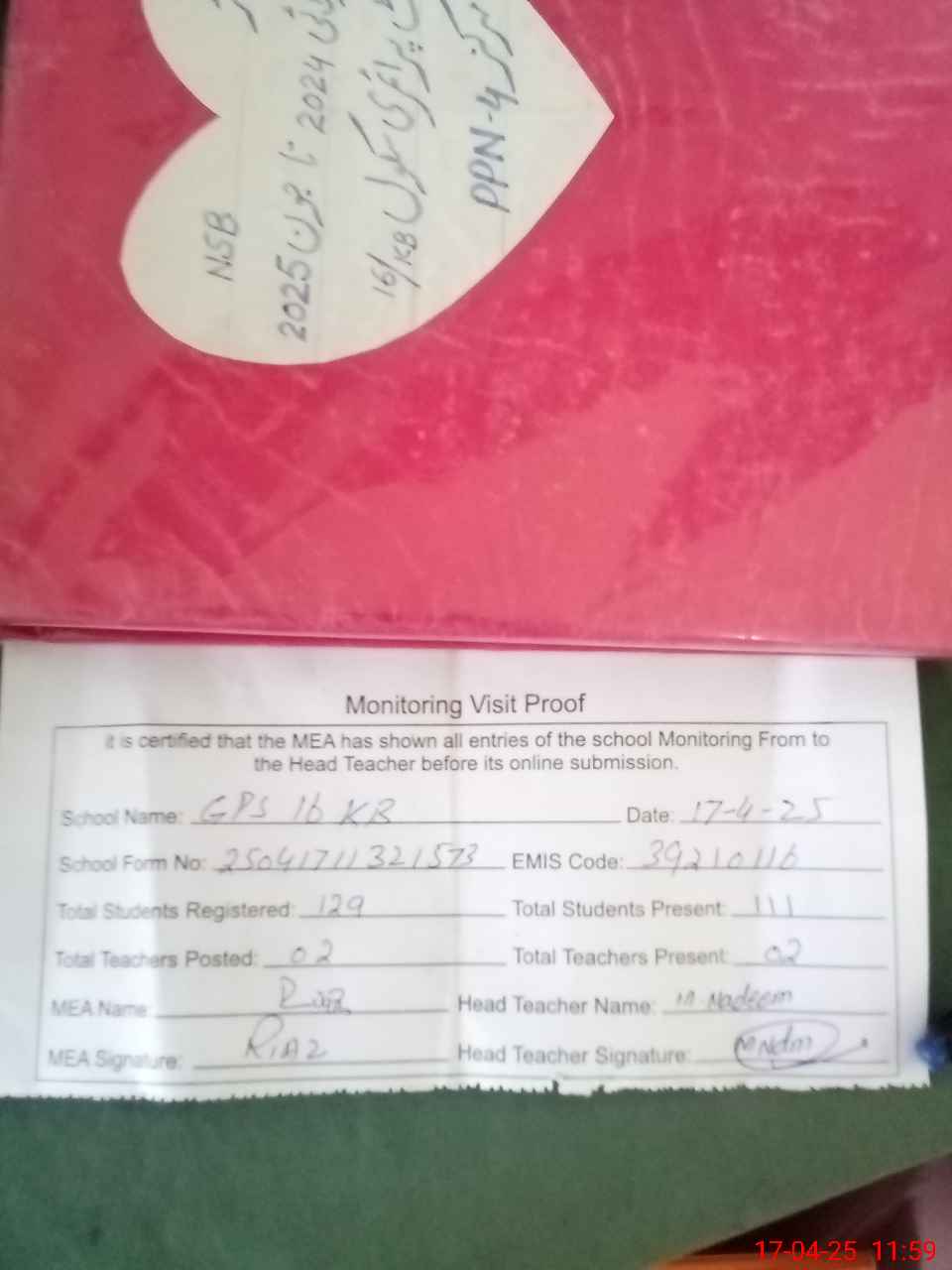 | Attendance Register | Head Teacher | MEA with School | Visit Proof |