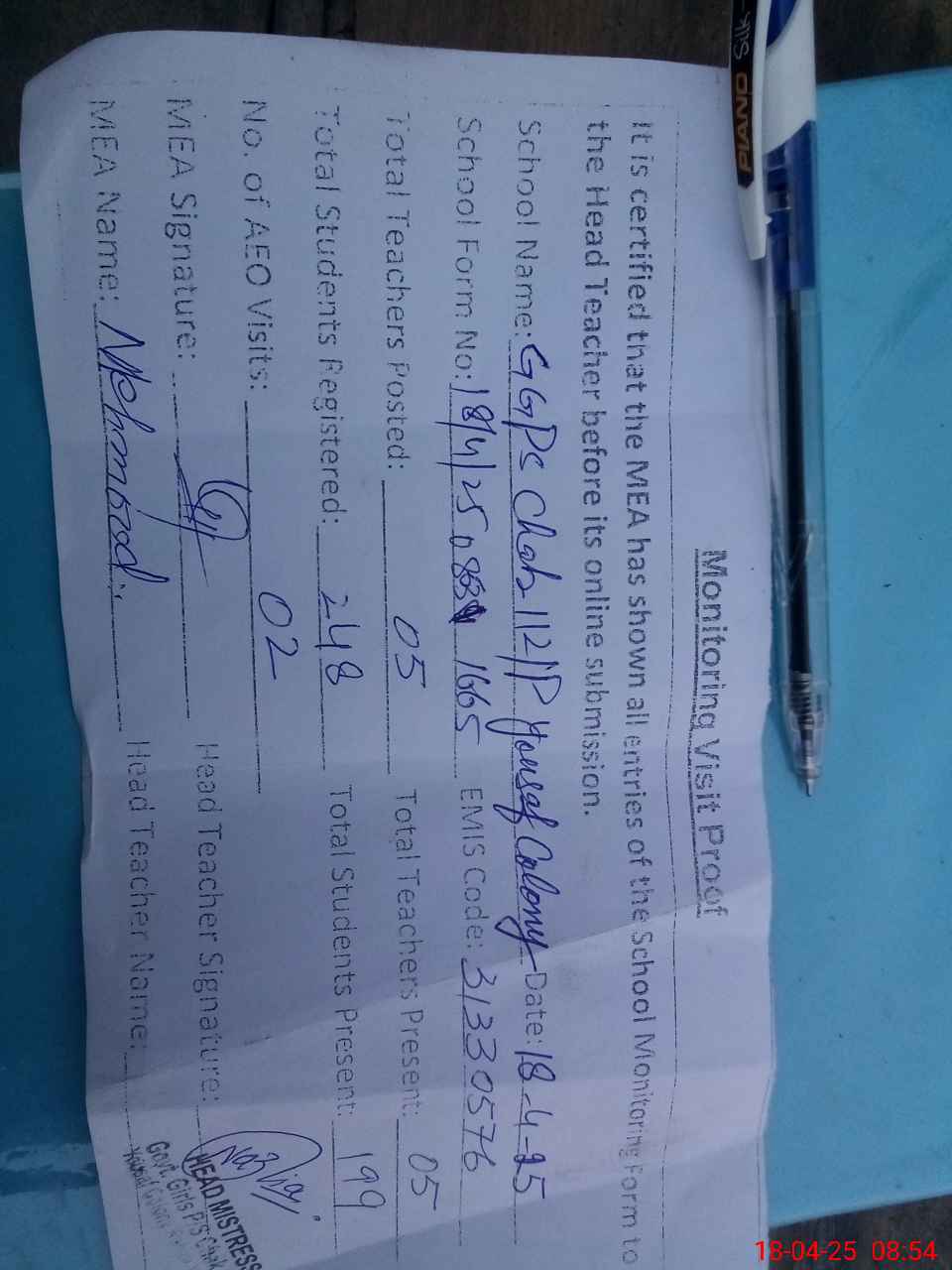 | Attendance Register | Head Teacher | MEA with School | Visit Proof |