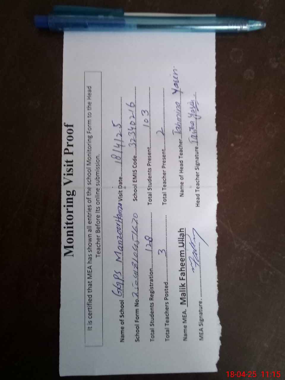 | Attendance Register | Head Teacher | MEA with School | Visit Proof |