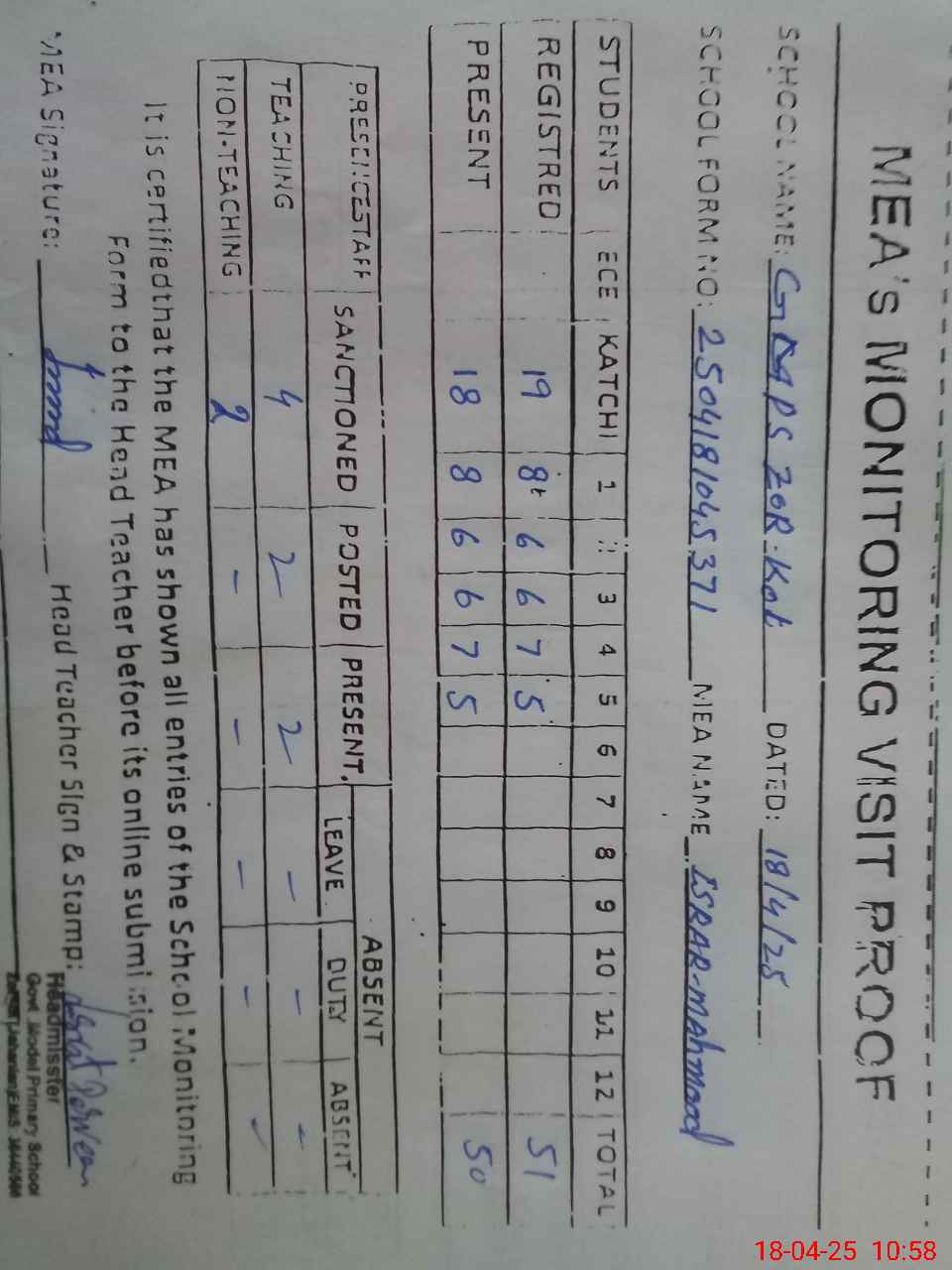| Attendance Register | Head Teacher | MEA with School | Visit Proof |