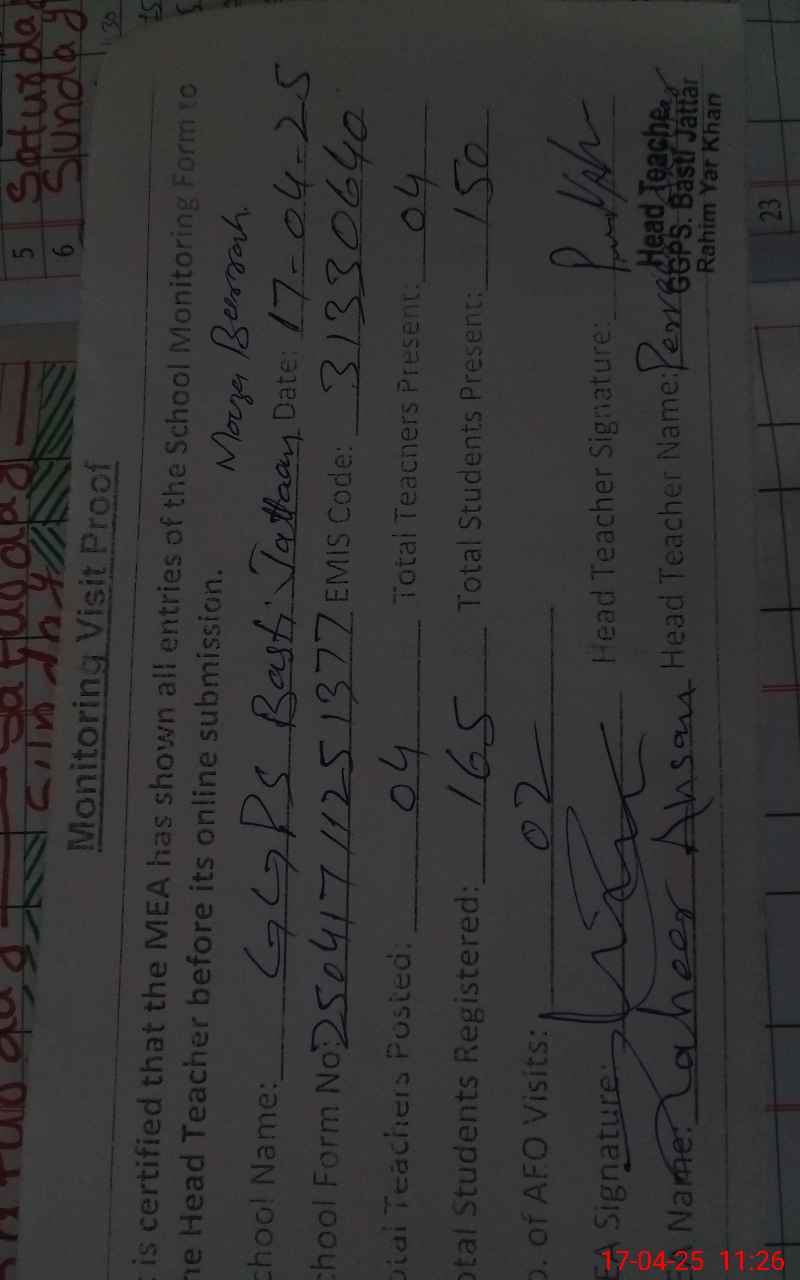 | Attendance Register | Head Teacher | MEA with School | Visit Proof |
