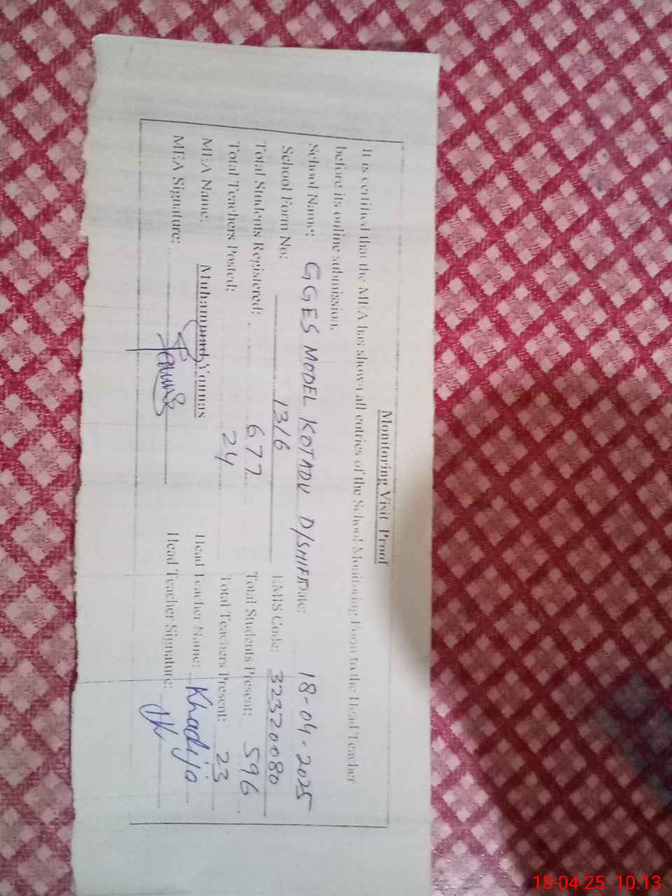 | Certified that this School was Inspected by the Undersigned MEA/DMO Today and the Information Stated Above is as Per Record. | |||||