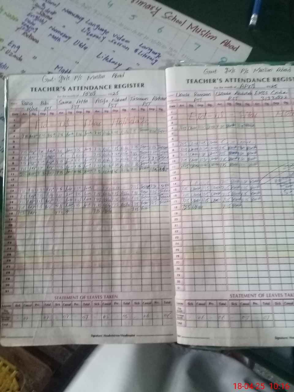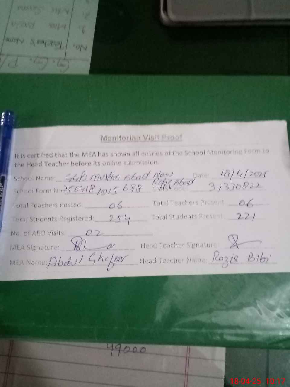 | Attendance Register | Head Teacher | MEA with School | Visit Proof |