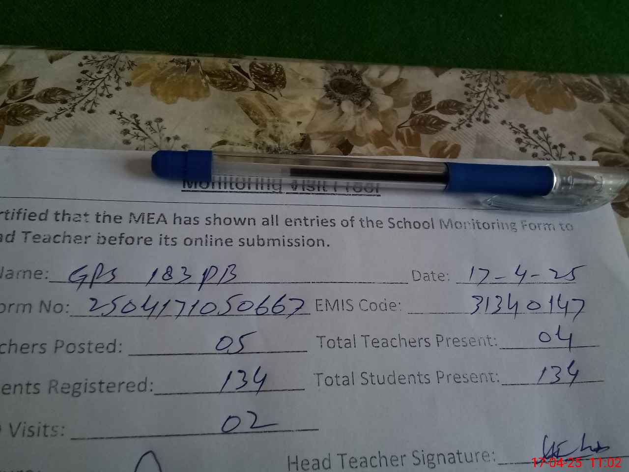 | Attendance Register | Head Teacher | MEA with School | Visit Proof |