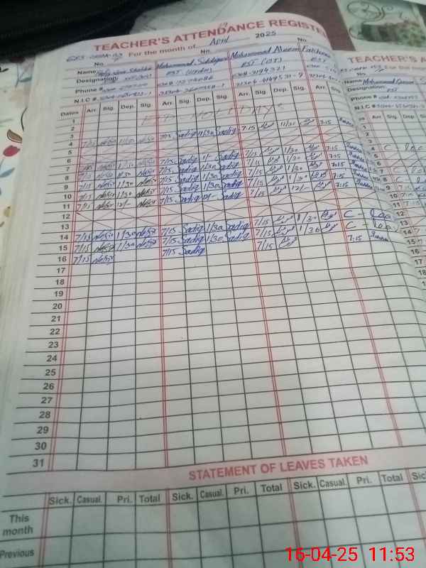 | CNIC | Full Name | Designation | R/C | Absence During Last Calender Month |