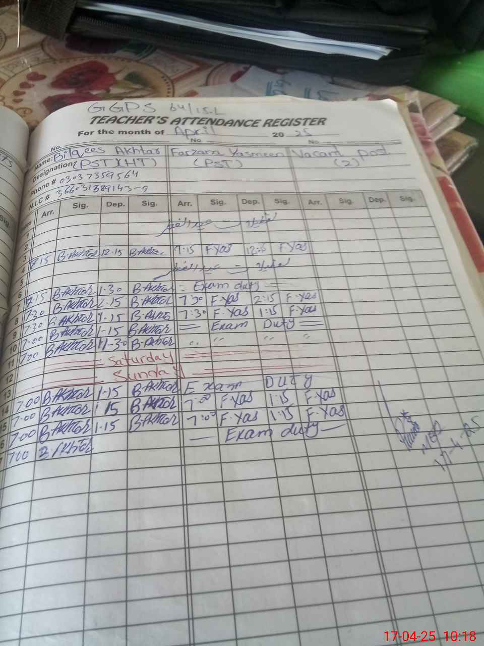 | 36**** | Fa**** Ya**** | PST | Regular | 2 | 7 | 0 | 0 | 0 | 0 | 0 | 0 | 2 | Exam Duty |
