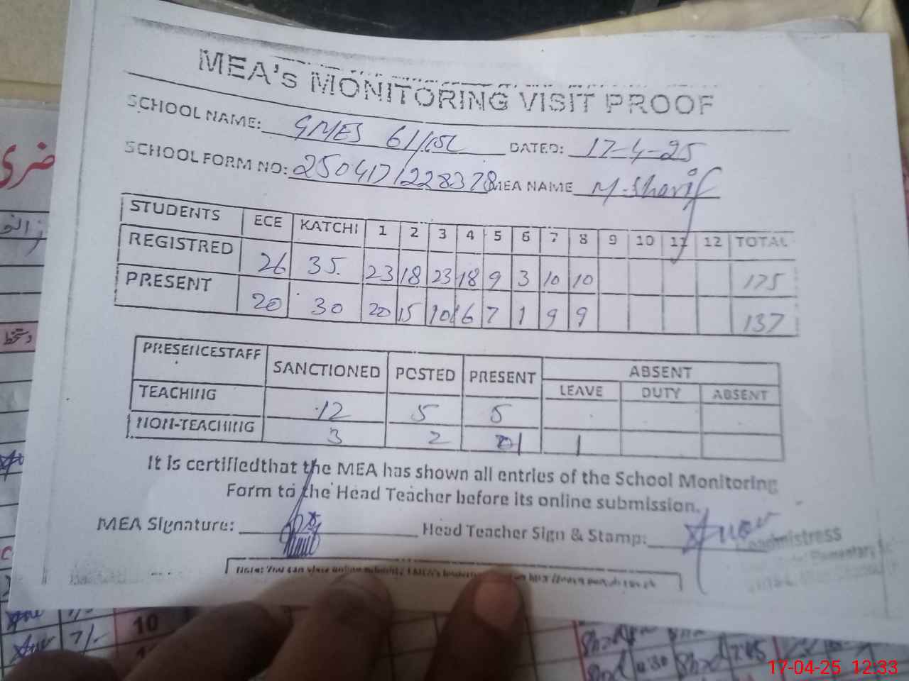 | Attendance Register | Head Teacher | MEA with School | Visit Proof |