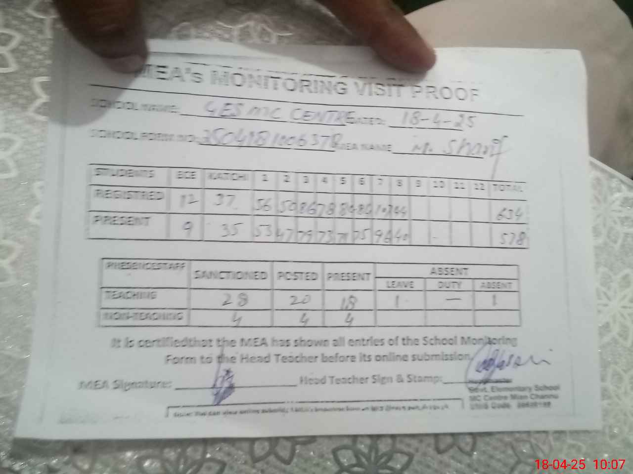 | EMIS Code: 36430132 | Name of School: GES MC CENTRE MIAN CHANNU | |||