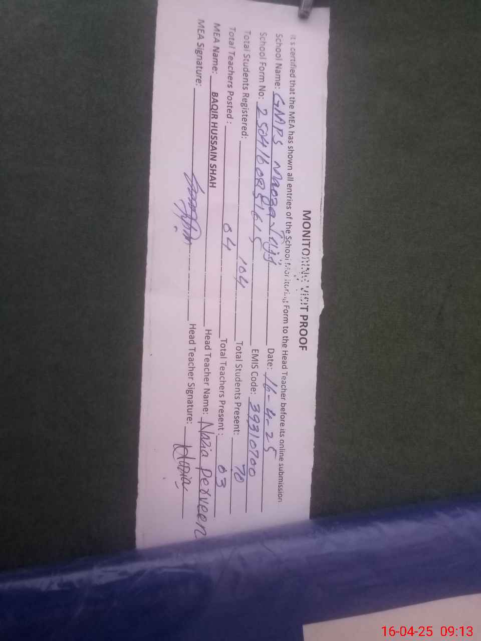 | Attendance Register | Head Teacher | MEA with School | Visit Proof |