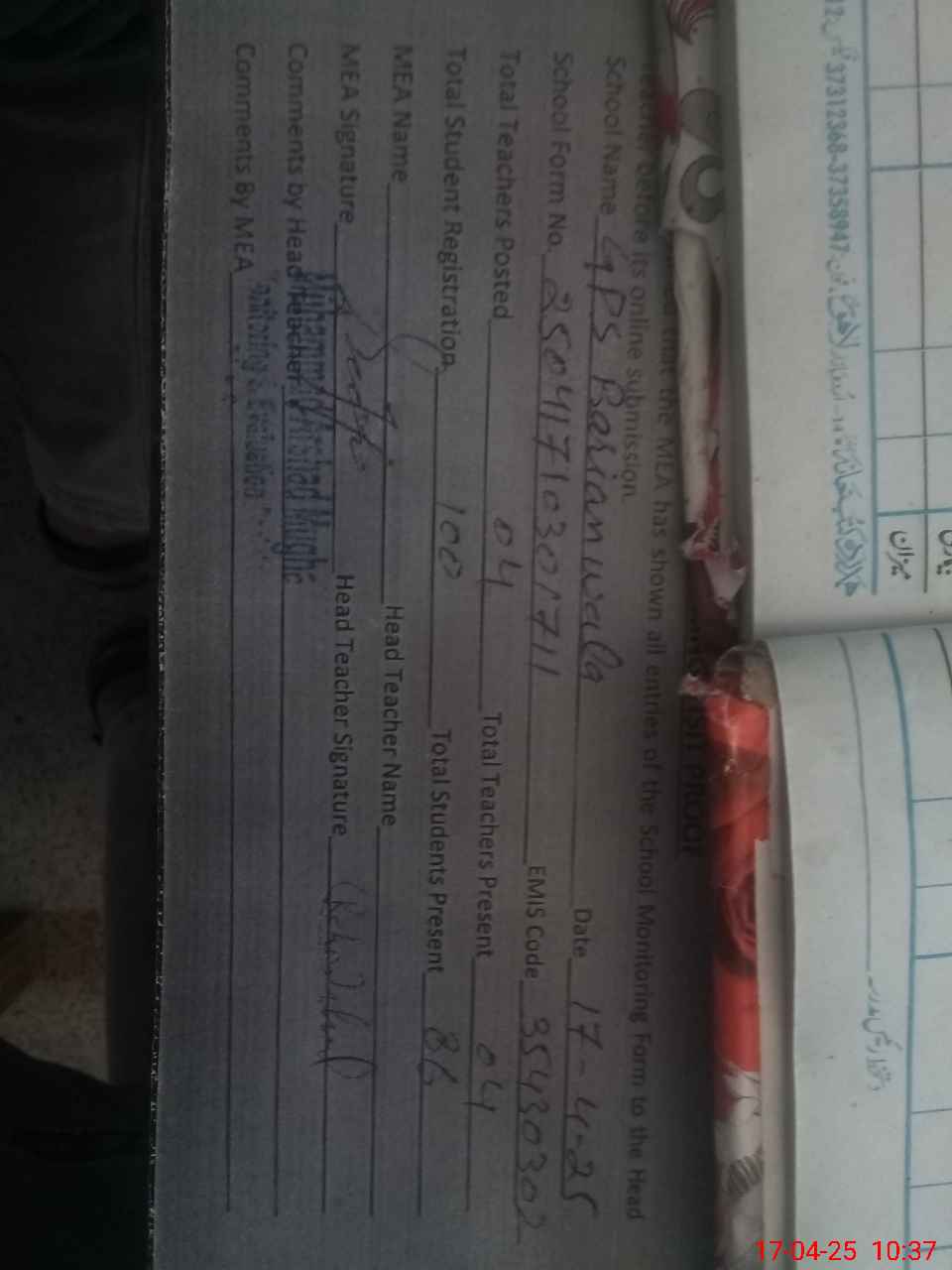 | Attendance Register | Head Teacher | MEA with School | Visit Proof |