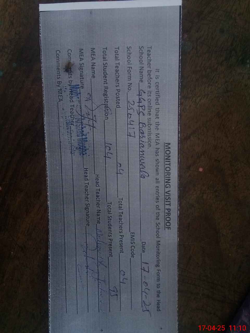 | Attendance Register | Head Teacher | MEA with School | Visit Proof |