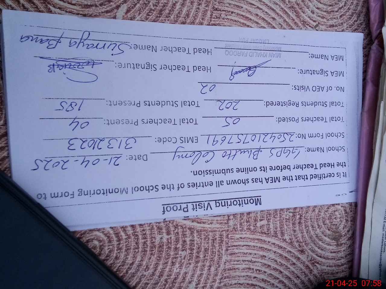 | Certified that this School was Inspected by the Undersigned MEA/DMO Today and the Information Stated Above is as Per Record. | |||||