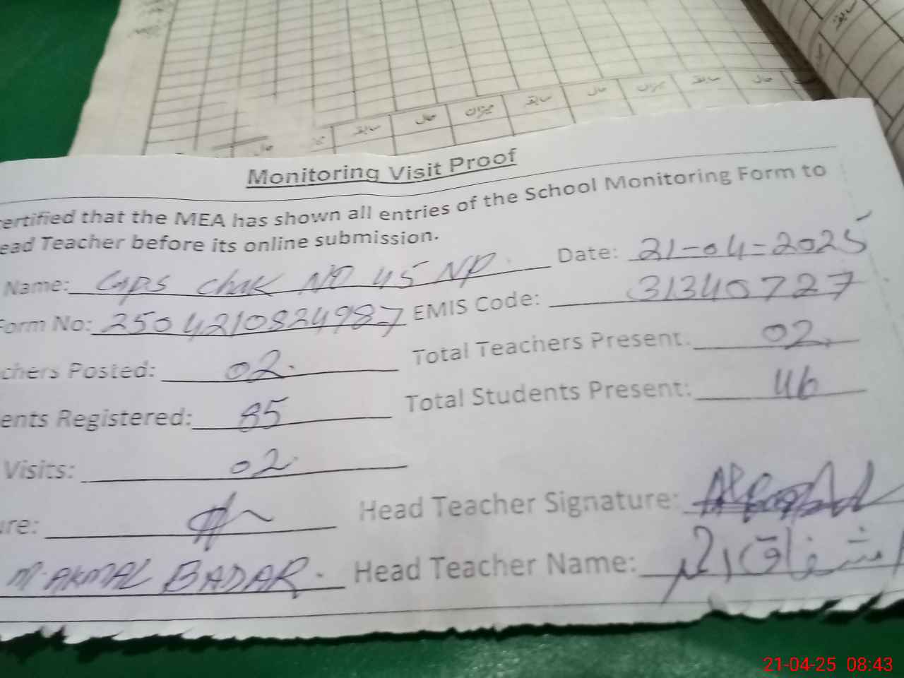 | EMIS Code: 31340727 | Name of School: GPS CHAK NO. 45/NP | |||