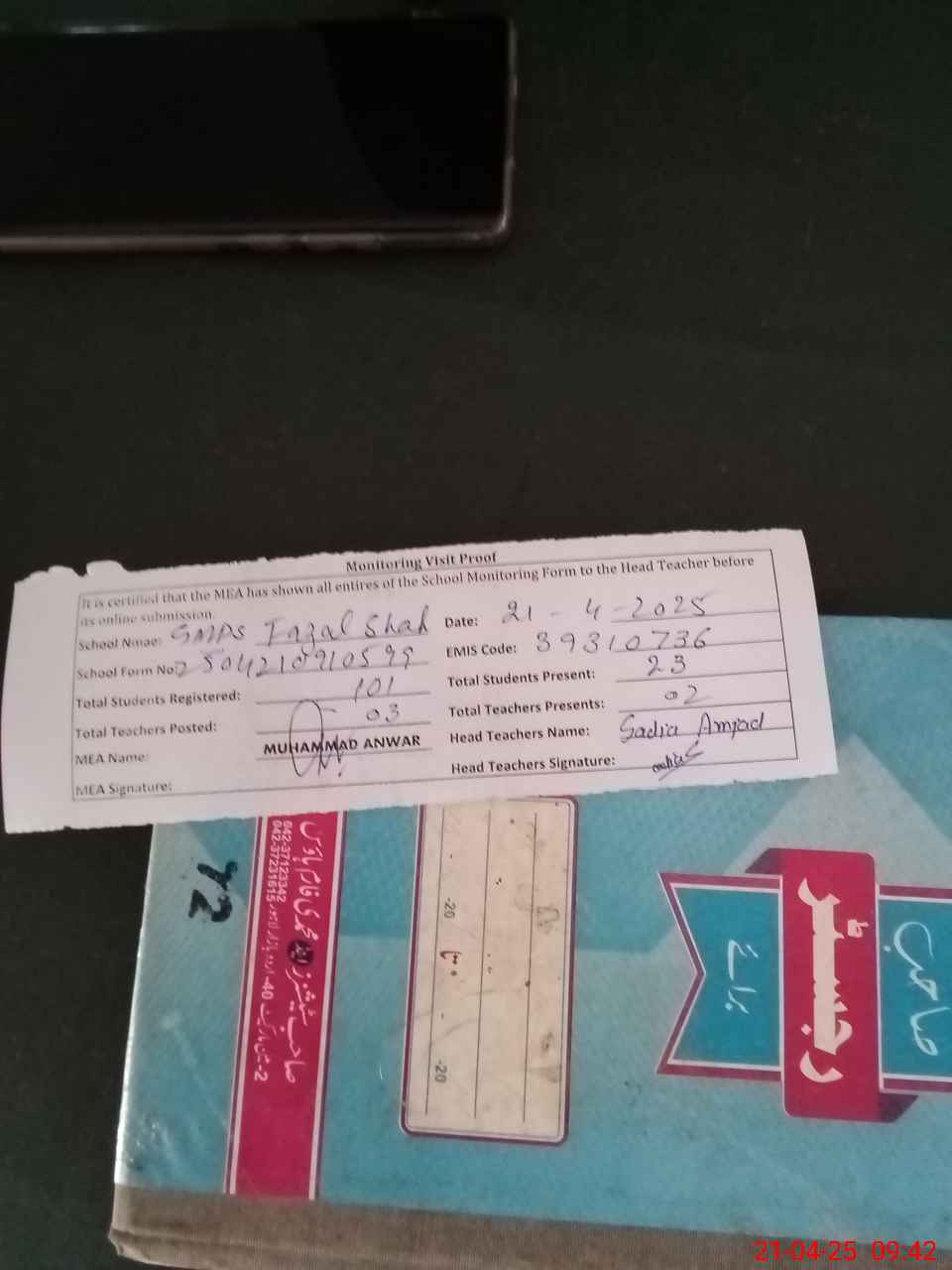| Attendance Register | Head Teacher | MEA with School | Visit Proof |