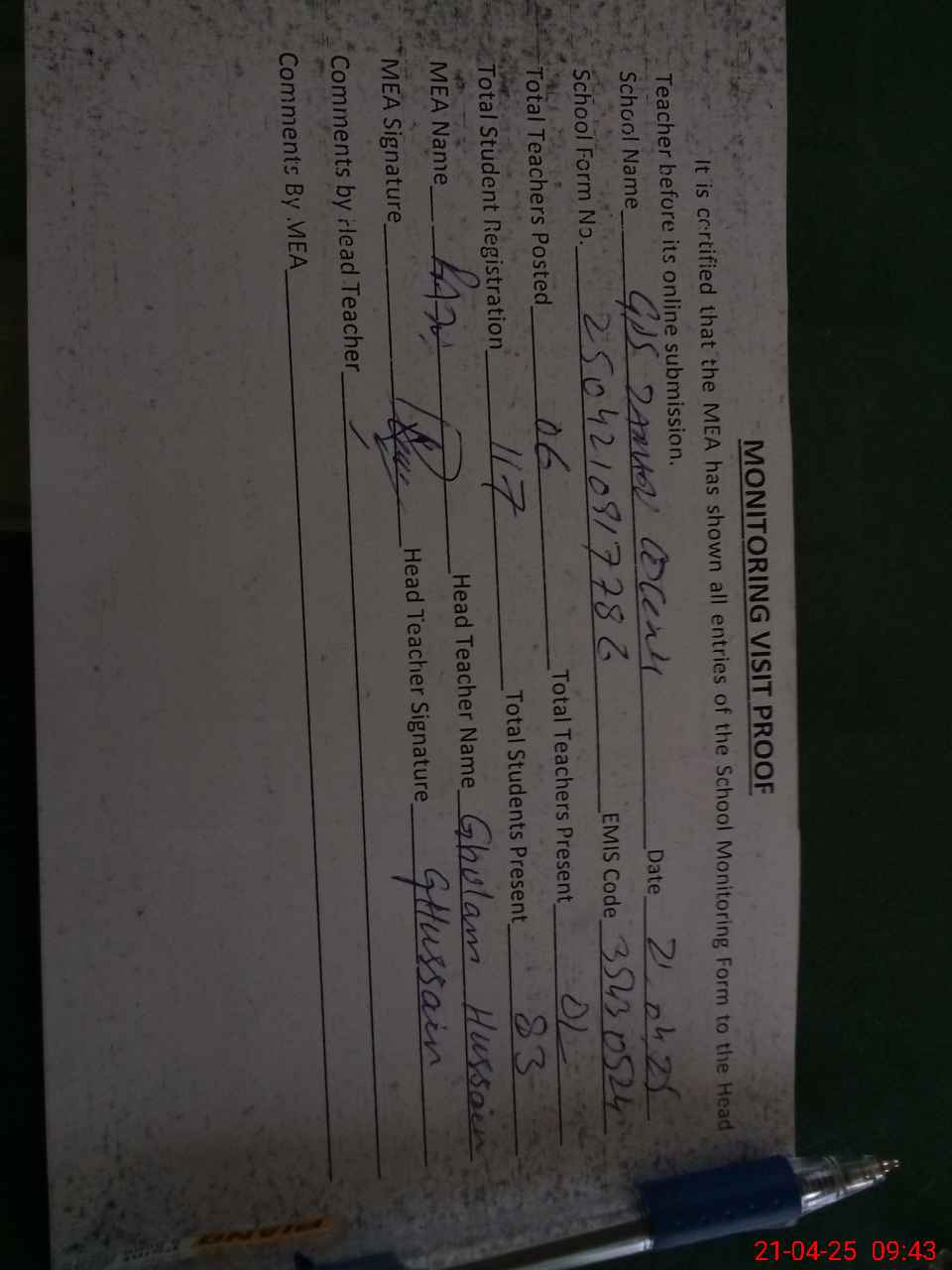 | Attendance Register | Head Teacher | MEA with School | Visit Proof |