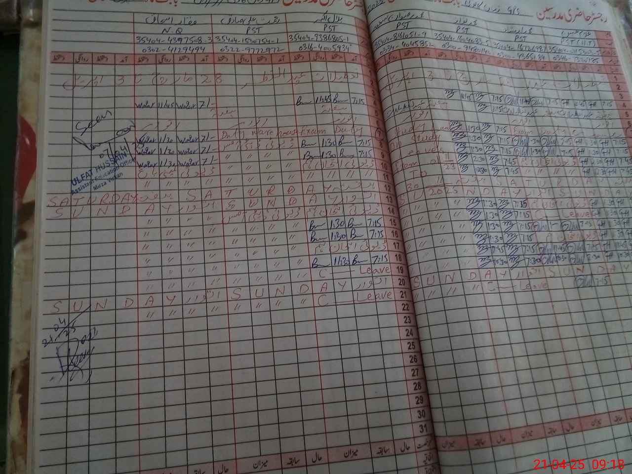 | CNIC | Full Name | Designation | R/C | Absence During Last Calender Month |