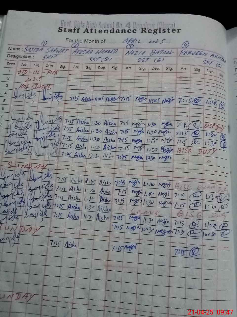 | CNIC | Full Name | Designation | R/C | Absence During Last Calender Month |