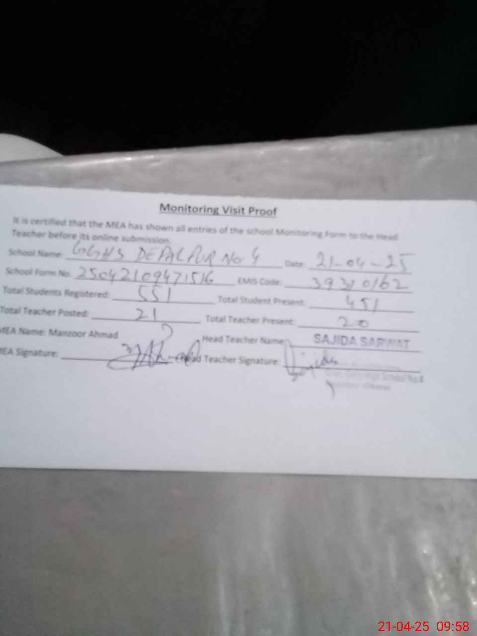 | Attendance Register | Head Teacher | MEA with School | Visit Proof |