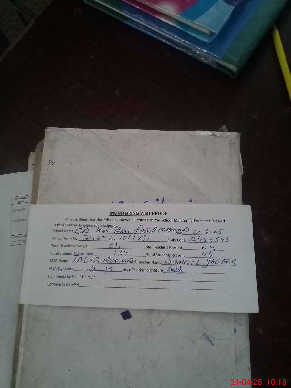 | Attendance Register | Head Teacher | MEA with School | Visit Proof |