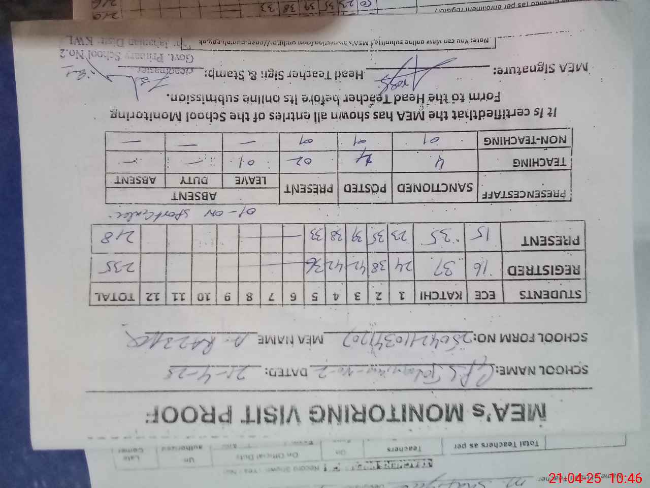 | Attendance Register | Head Teacher | MEA with School | Visit Proof |