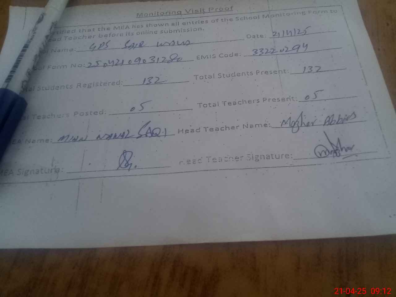 | EMIS Code: 33220294 | Name of School: GPS SAIR WALA | |||