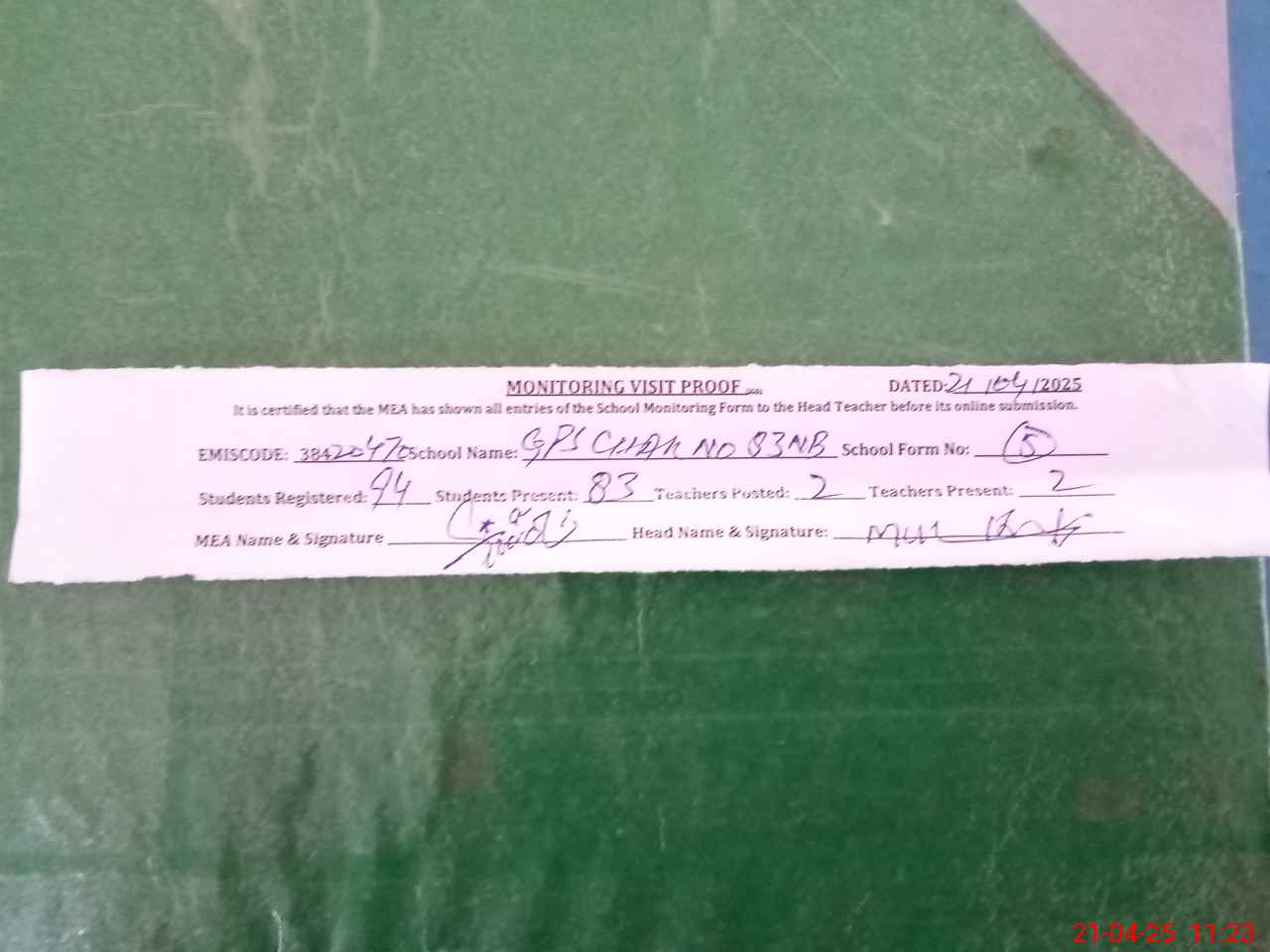 | Attendance Register | Head Teacher | MEA with School | Visit Proof |