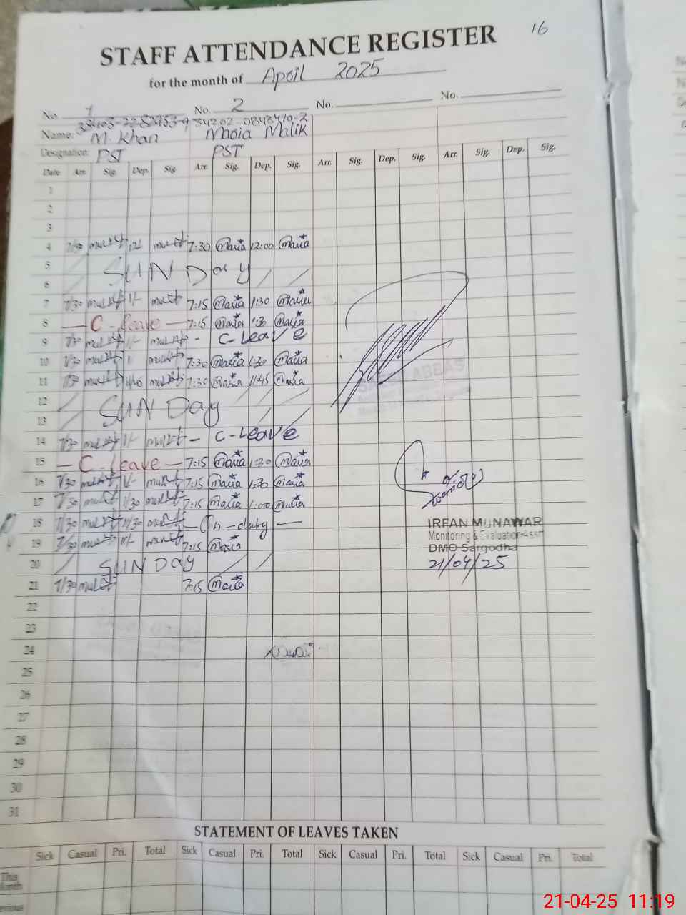 | CNIC | Full Name | Designation | R/C | Absence During Last Calender Month |