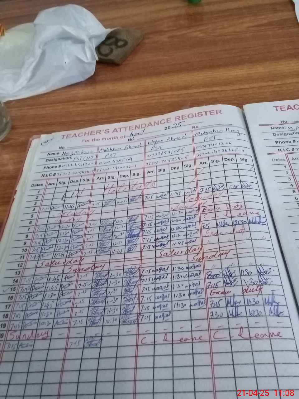 | CNIC | Full Name | Designation | R/C | Absence During Last Calender Month |