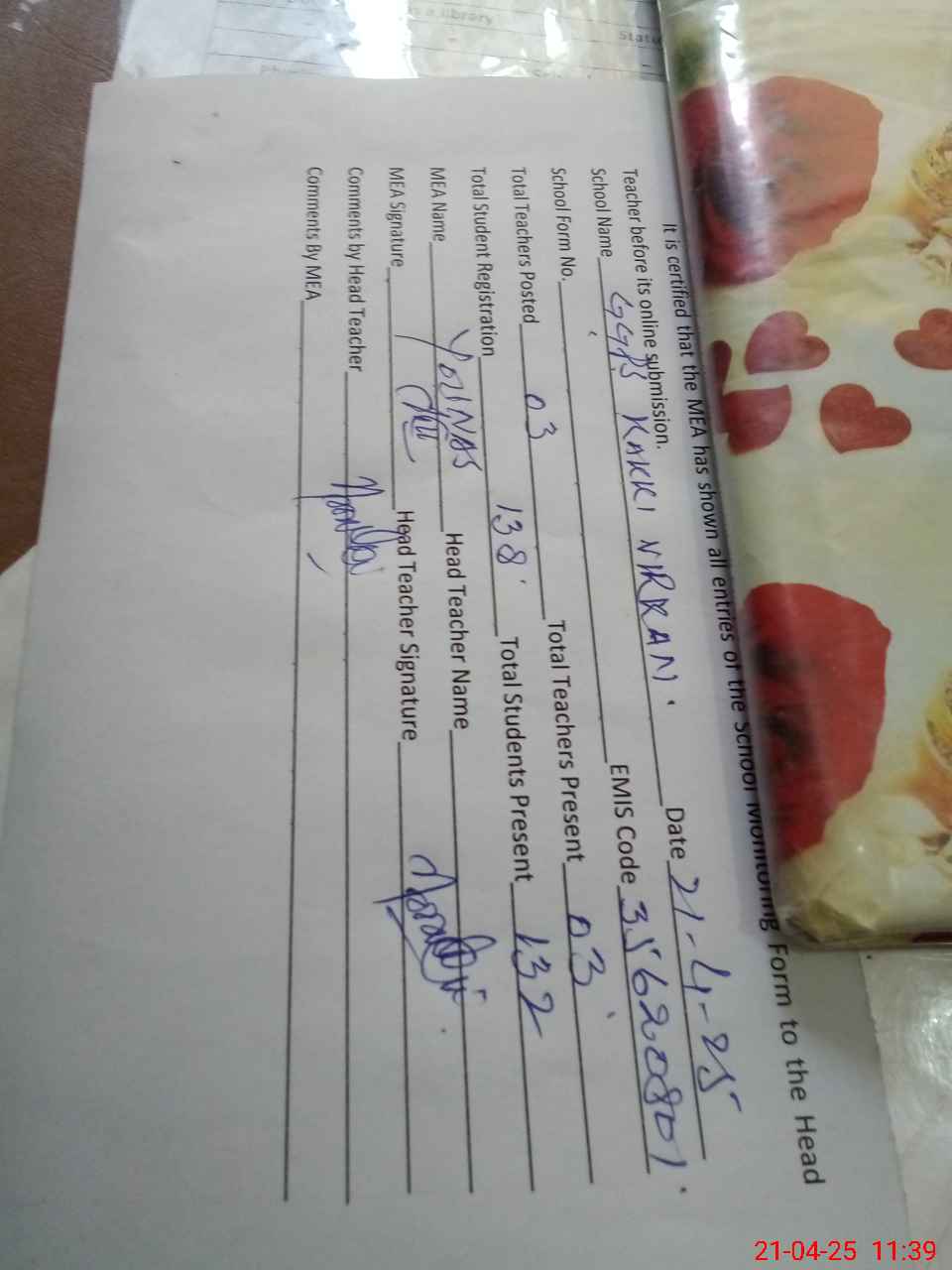 | Attendance Register | Head Teacher | MEA with School | Visit Proof |