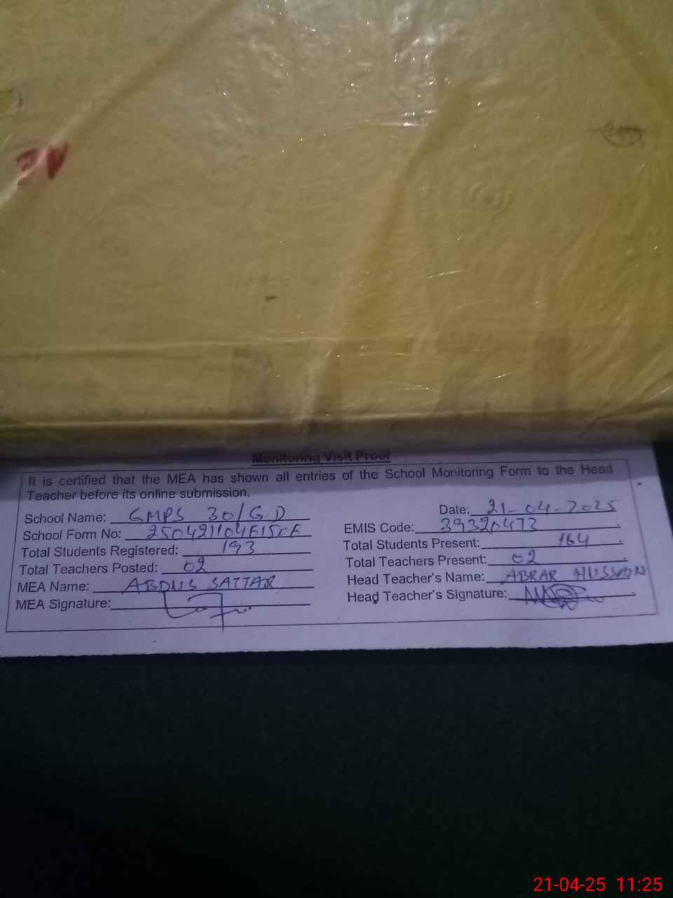 | Attendance Register | Head Teacher | MEA with School | Visit Proof |
