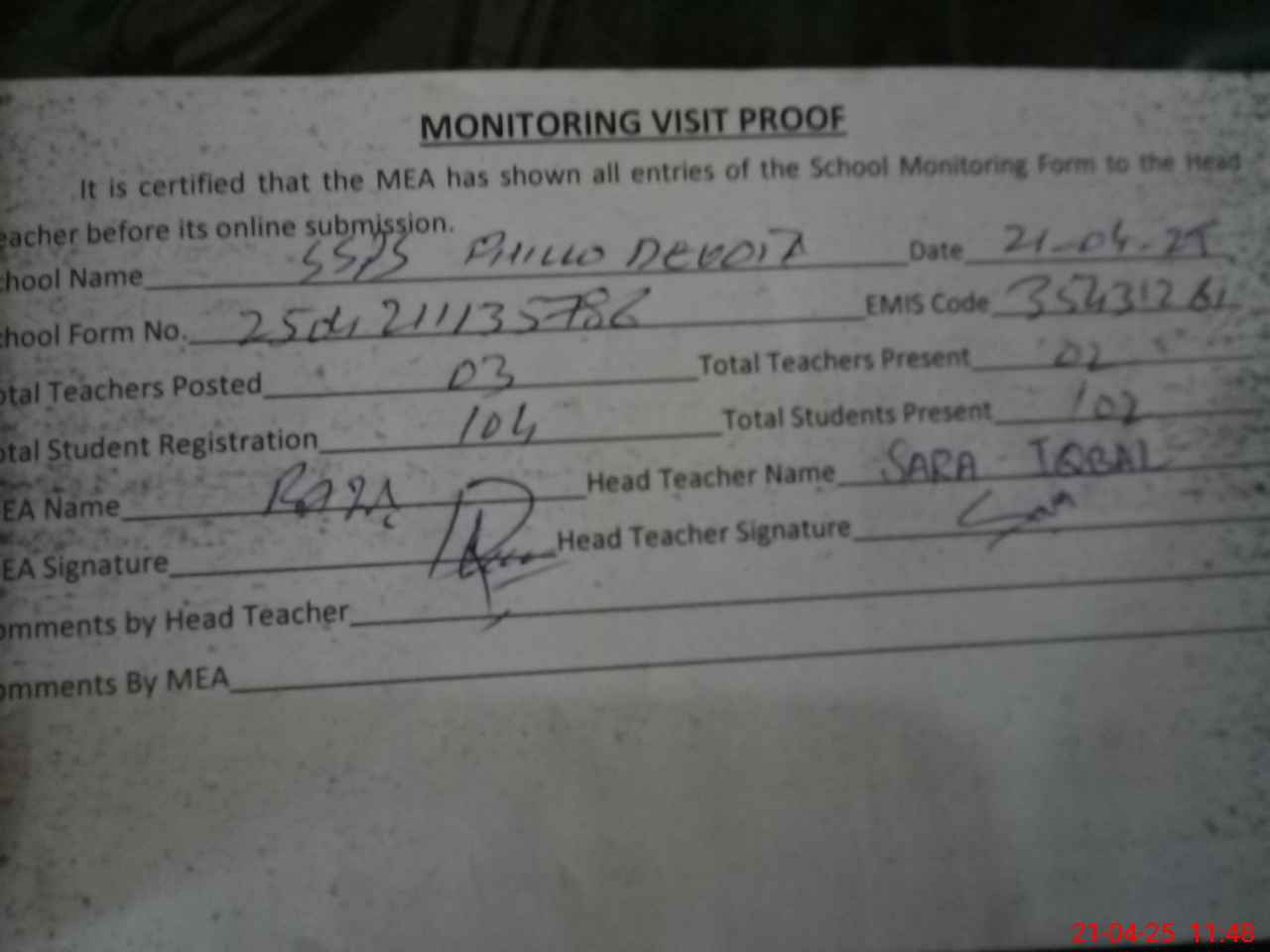 | Attendance Register | Head Teacher | MEA with School | Visit Proof |