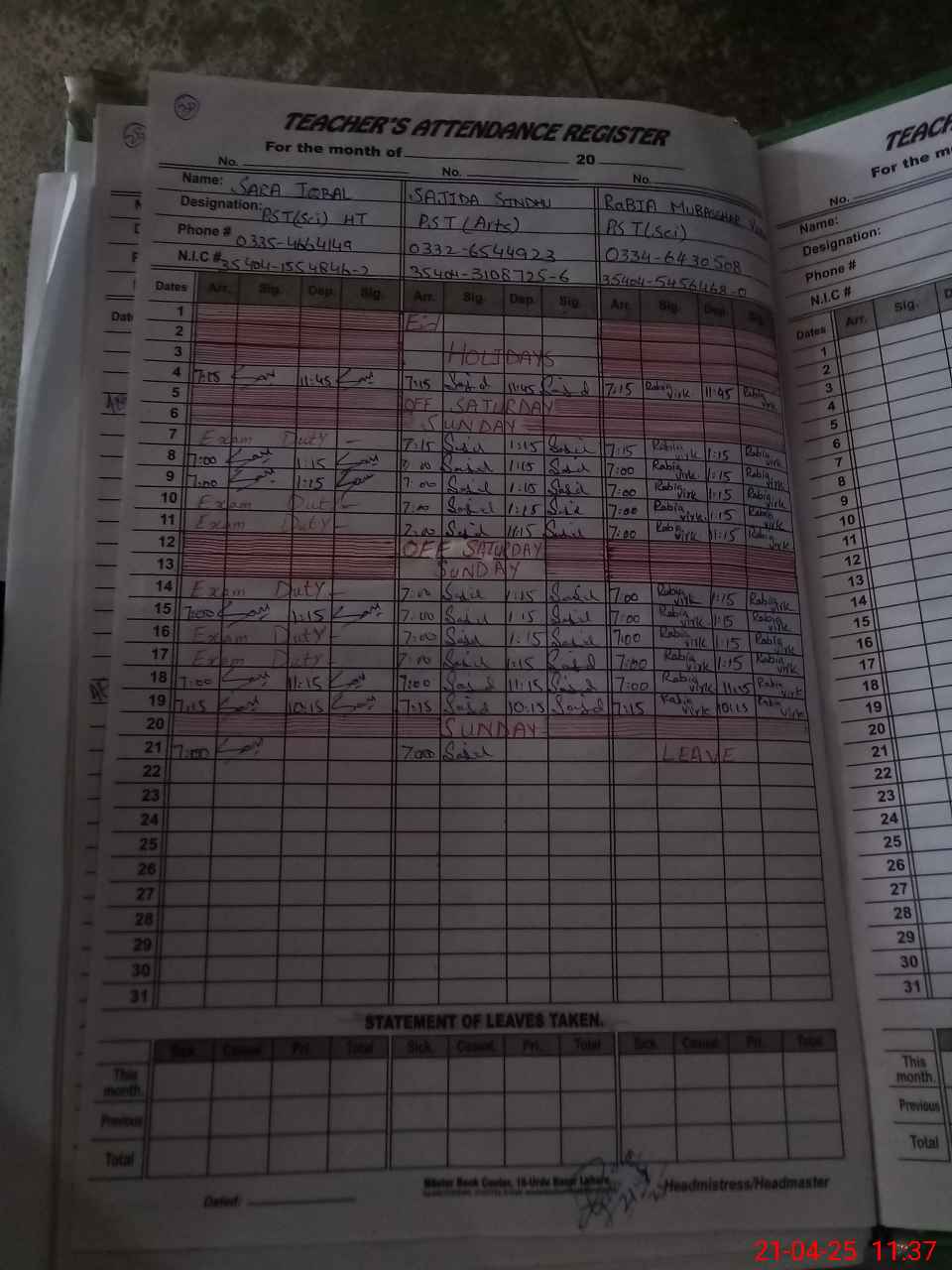 | Name: SA**** IQ**** Designation: (School Headmaster's/Headmistress's) PST Phone/Cell Number: 03**** |