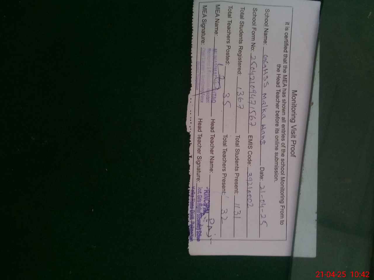 | Attendance Register | Head Teacher | MEA with School | Visit Proof |